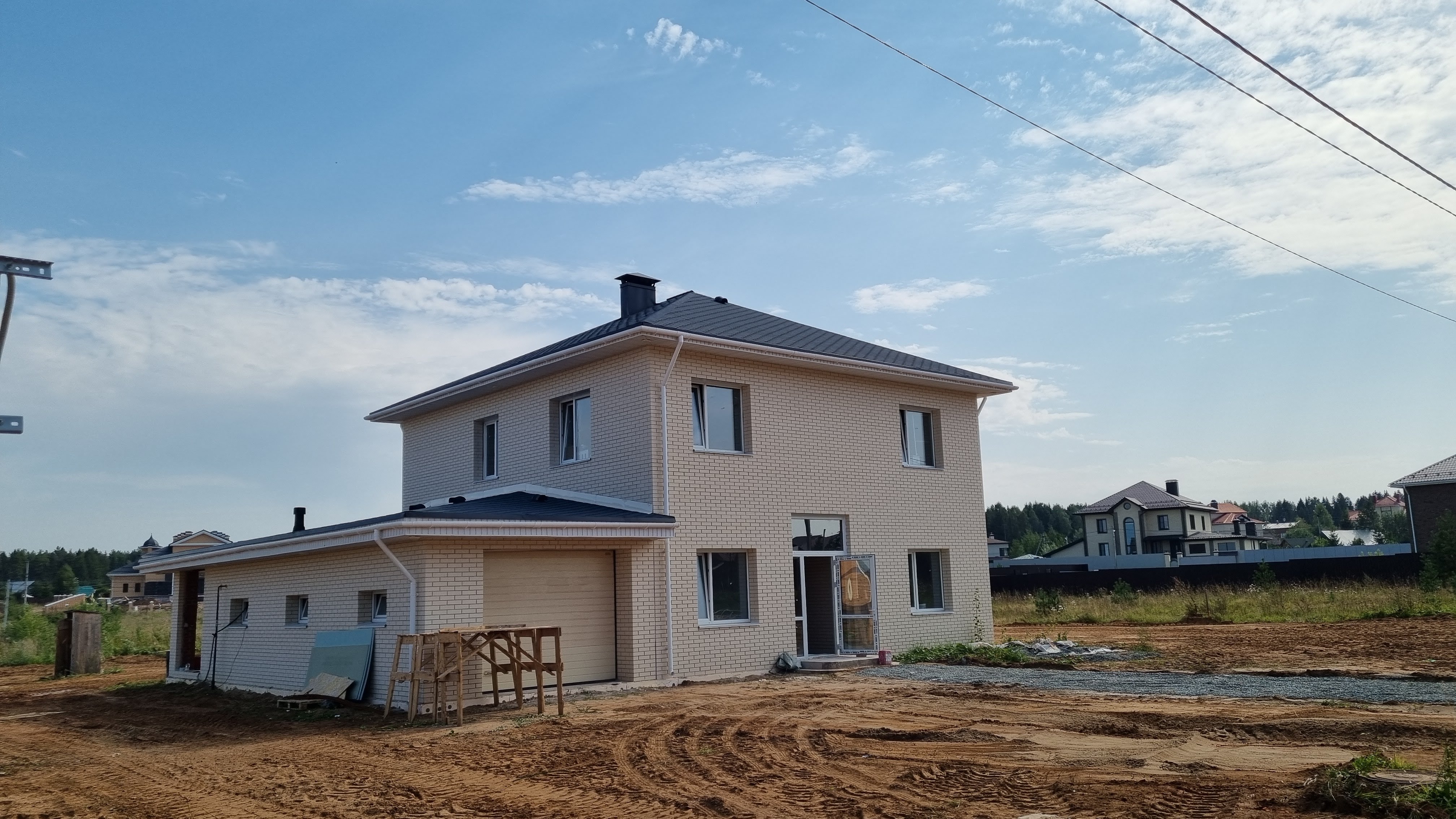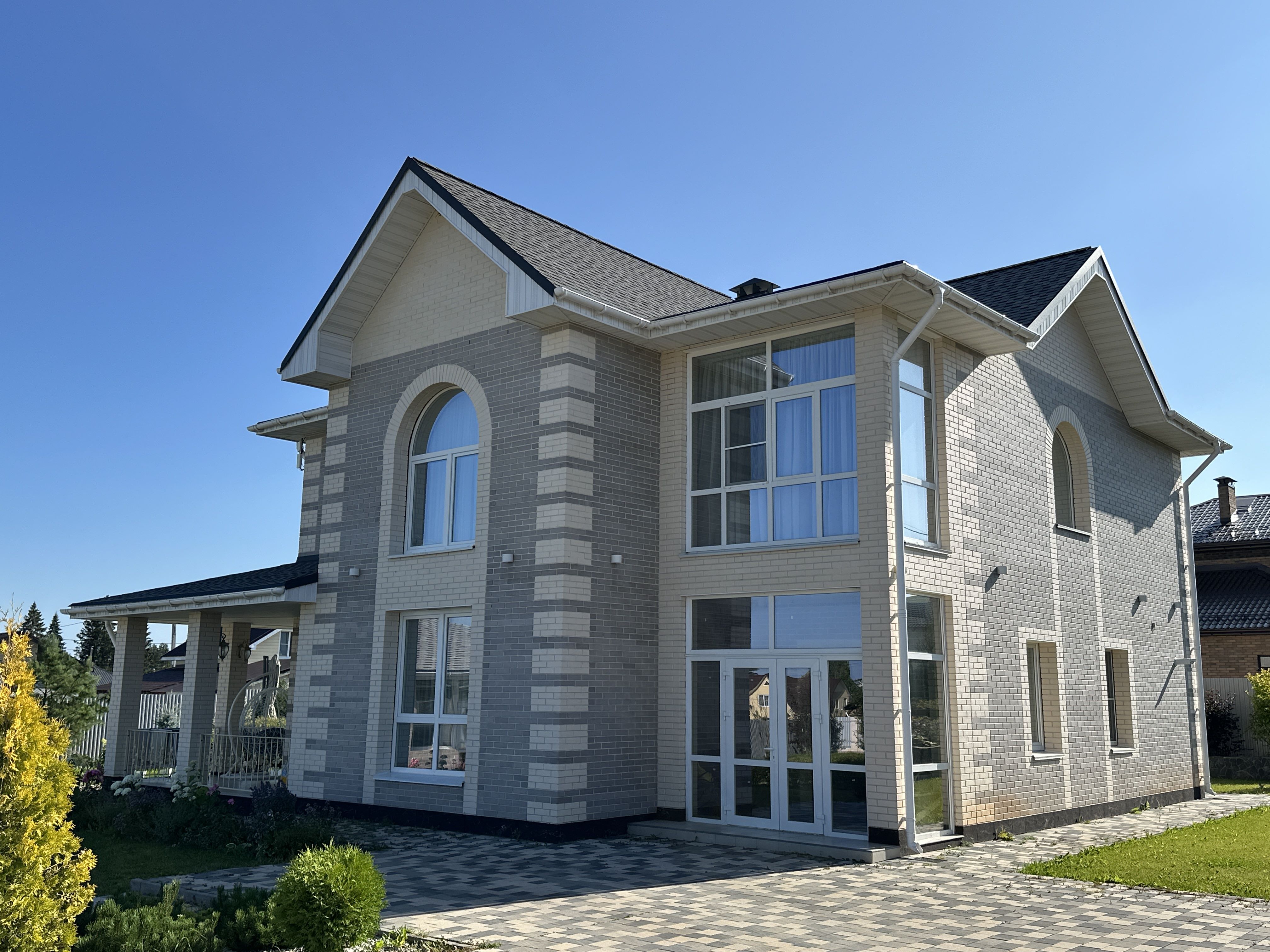 Еще один наш проект – большой кирпичный дом с мансардой. В нем есть много пространства для всей семьи. Дом очень светлый и уютный – это создается благодаря большим панорамным окнам и использованию светлых оттенков в отделке интерьера.